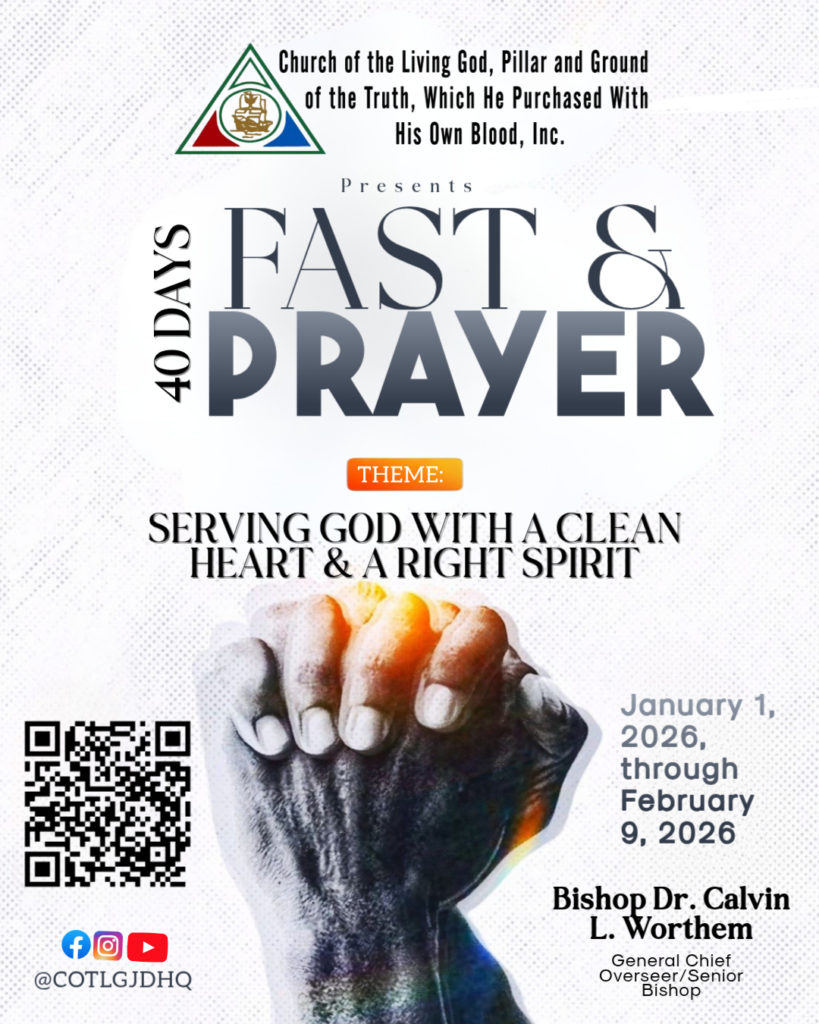 Saints in observance of the 40-Day’s Fast (12:00 midnight to 12:00 noon) beginning January 1, 2026, through February 9, 2026, we as believers need to fast and develop a closer relationship with God. Fasting, Praying, and Sacrificing are the quickest ways to get power from God. We cannot navigate through the End-time storms of life if we do not practice fasting, praying, and sacrificing things that take up more of our time than our time with God. “I beseech you therefore, brethren, by the mercies of God, that ye present your bodies a living sacrifice, holy, acceptable unto God, which is your reasonable service. And be not conformed to this world: but be ye transformed by the renewing of your mind, that ye may prove what is that good, and acceptable, and perfect, will of God.” (Romans 12:1-2)